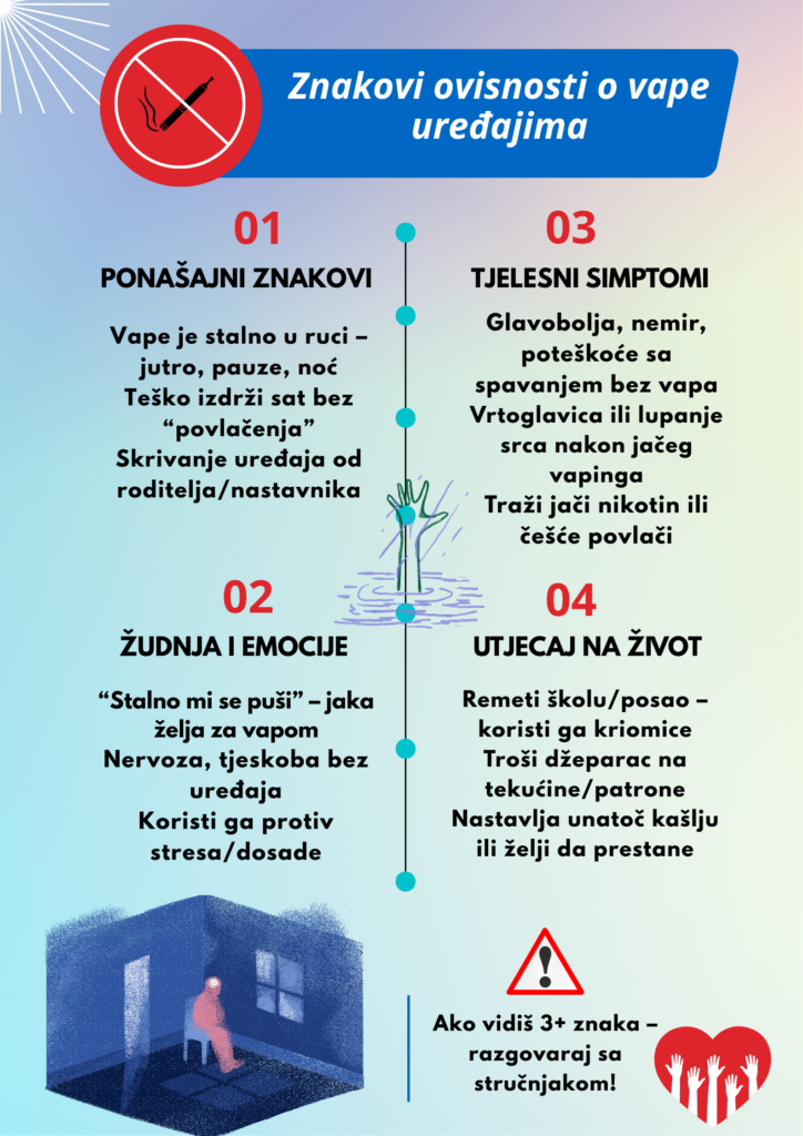 Kada je riječ o djeci, adolescentima i mladim odraslim osobama, WHO u svojim informativnim dokumentima jasno navodi da se uporaba e-cigareta i vape uređaja smatra nesigurnom, jer uvodi ili učvršćuje nikotinsku ovisnost i nepotrebno izlaže dišni sustav i mozak štetnim tvarima. Zbog toga, kako navodi WHO u fact sheetu o regulaciji e-cigareta, mnoge države uvode ograničenja okusa, zabrane oglašavanja, stroge dobne granice i druga regulatorna rješenja s ciljem smanjenja privlačnosti ovih proizvoda mladima.
