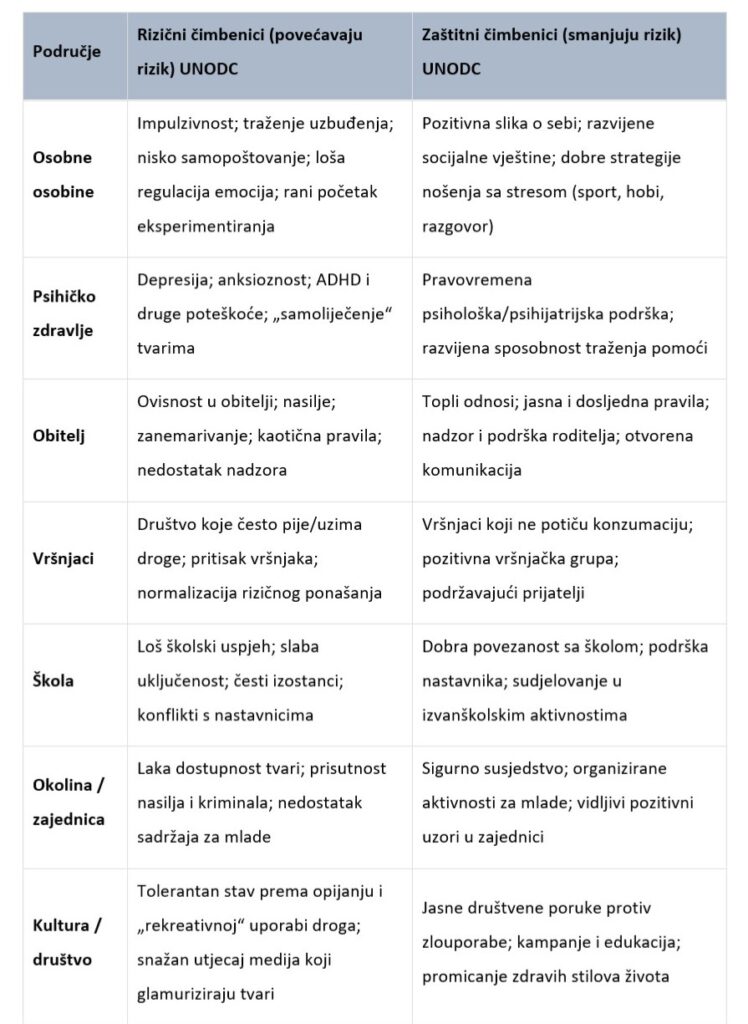 Autori koji se bave rizičnim i zaštitnim čimbenicima u zajednici, poput stručnjaka Hawkinsa, Catalana i Millera, ukazuju da obiteljska povijest ovisnosti, nasilje, zanemarivanje i učestali sukobi u obitelji znatno povećavaju rizik za razvoj ovisnosti. Istraživanja u području razvoja mladih i prevencije ovisnosti pokazuju da vršnjačka skupina ima snažan utjeca. Ukoliko se droga u društvu doživljava kao „normalna“ i lako dostupnom, veća je vjerojatnost da će se rizična uporaba održavati. S druge strane, UNODC i Vijeće Europe u svojim dokumentima naglašavaju važnost podržavajućih roditelja, jasnih granica, povezanosti sa školom i konstruktivnih aktivnosti kao ključnih zaštitnih faktora u životu mlade osobe.