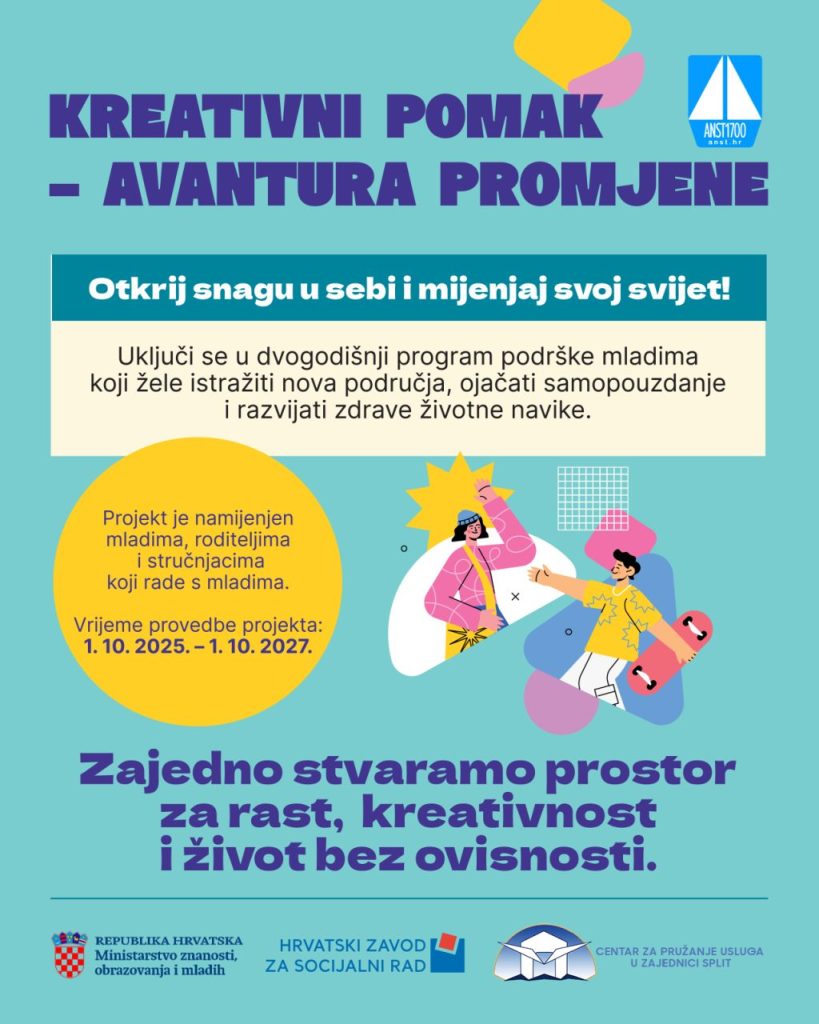 U s prvim danom listopada naša udruga započela je provedba projekta „Kreativni pomak – avantura promjene“, koji traje do listopada 2027. godine. Projekt je namijenjen mladima, roditeljima i stručnjacima koji rade s mladima, a cilj nam je provedbom različitih aktivnosti potaknuti osobni razvoj, osnažiti samopouzdanje i promicati zdrave životne navike ciljane populacije. Projekt je financiran sredstvima Ministarstva znanosti, obrazovanja i mladih kroz natječaj za projekte usmjerene mladima, a obuhvaća niz aktivnosti koje povezuju kreativnost, edukaciju i prevenciju rizičnih ponašanja, stvarajući poticajno okruženje za razvoj mladih. Od kreativnih aktivnosti, rada s glinom i dramskih radionica, preko edukativnih radionica u Tvornici čokolade, pa sve do izleta i kampova – projekt je usmjeren na osnaživanje mladih kako bi se aktivno uključili i sudjelovali u društvenim procesima kroz kvalitetno i kreativno provođenje slobodnog vremena, čime se izravno doprinosi i jačanju zaštitnih faktora i smanjenju rizika povezanih s prevencijom ovisnosti. Partneri na projektu su Zavod za socijalni rad – Područni ured Split i Centar za pružanje usluga u zajednici Split.